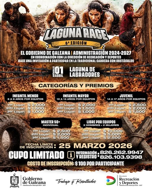 ¿Listos para el reto?Regresa a Galeana una de las competencias más esperadas: Laguna Race – 6ª ediciónUna carrera con obstáculos que pondrá a prueba la fuerza, la resistencia y el trabajo en equipo, en un escenario único como lo es